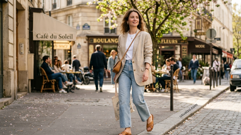 Why it works for 2026: The “anti-blazer” (unstructured, breathable linen) is the hero piece of spring fashion 2026.